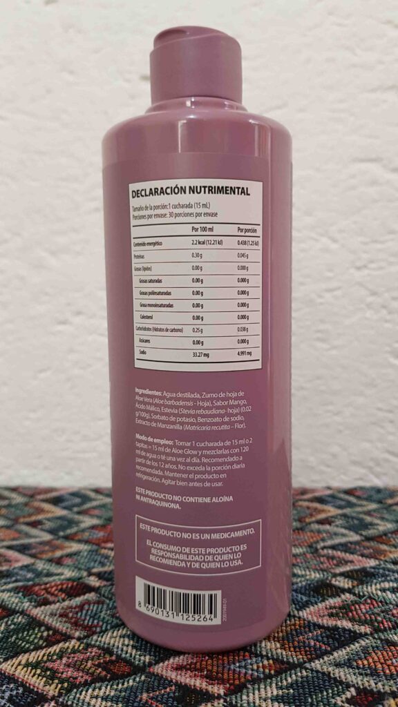 El suplemento Aloe Glow Nutriplus viene en una botellita color Lila perfectamente sellada y etiquetada. Además viene con una taparrosca tipo flip top con dispensador. El color de toda la presentación en general, es el de la línea Nutriplus, por lo que es prácticamente inconfundible. El sello de la botella es muy fuerte, por lo que el líquido nunca se escapará antes de usarlo por primera vez. De ahí que hay que tener cuidado al quitar el sello. Además, en la botella encontraremos la información nutrimental impresa en la etiquetita. Muy importante en los productos que son suplementos alimenticios.