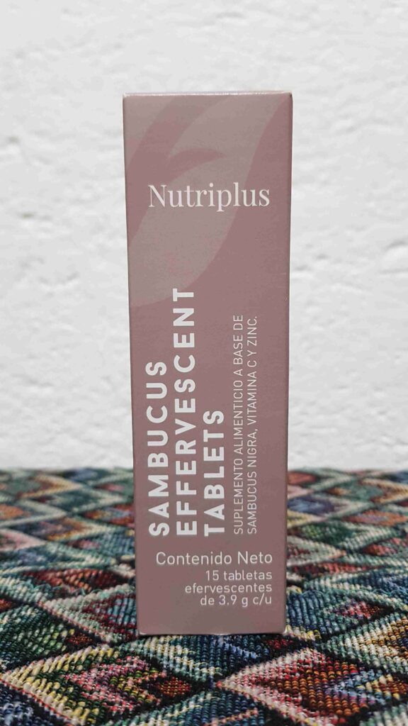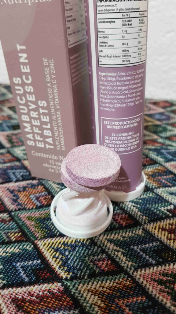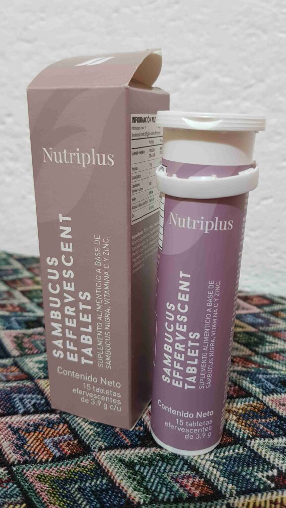 El suplemento Sambucus Farmasi viene en un tubito color blanco perfectamente sellado y etiquetado. La cajita donde viene protegido el tubo posee el color lila “quemado” de la línea Nutriplus que es típica de los productos con doble embalaje. Y que ayuda a proteger en extremis la delicada fórmula de Sambucus, Vitamina C y Zinc para que mantengan todas sus propiedades intactas. Además, la cajita viene impresa con la información nutrimental. Muy importante en los productos que son suplementos alimenticios.